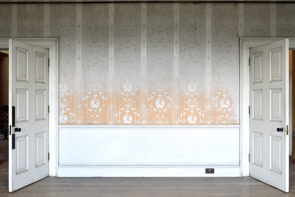 The original wallpaper in the ground-floor anteroom was painted over with cream coloured emulsion paint. In 1941, Sir Stephen Middleton, owner of Belsay Hall, wrote a letter to the estate manager asking him to arrange to ‘freshen up’ the anteroom, suggesting it was looking tired. The paint flattens the original appearance of this room, but we can glimpse the original pattern in certain areas, for example, above the mantelpiece, where the thickly printed pigments of the original wallpaper have left a raised pattern still visible under the paint.