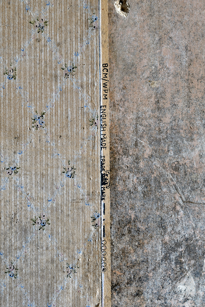 The edge of this wallpaper, in one of the servants’ rooms, was exposed when the adjoining section peeled back over time. It has revealed a selvedge mark indicating that the paper was made by the Wallpaper Manufacturers Association (WPM). The crown symbol is the logo of the WPM and dates back to the mid 19th century.