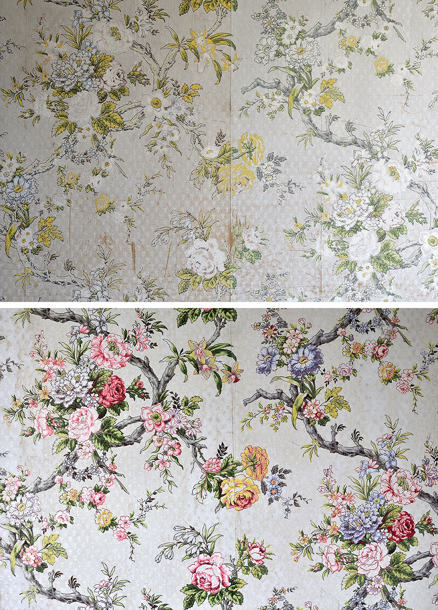 As seen in this comparison, the wallpaper in Stephen Middleton’s bedroom has suffered from light damage. The pigments have faded on the wallpaper in the bedroom (above) in contrast to the paper in the alcove which has been more protected from exposure to light (below).