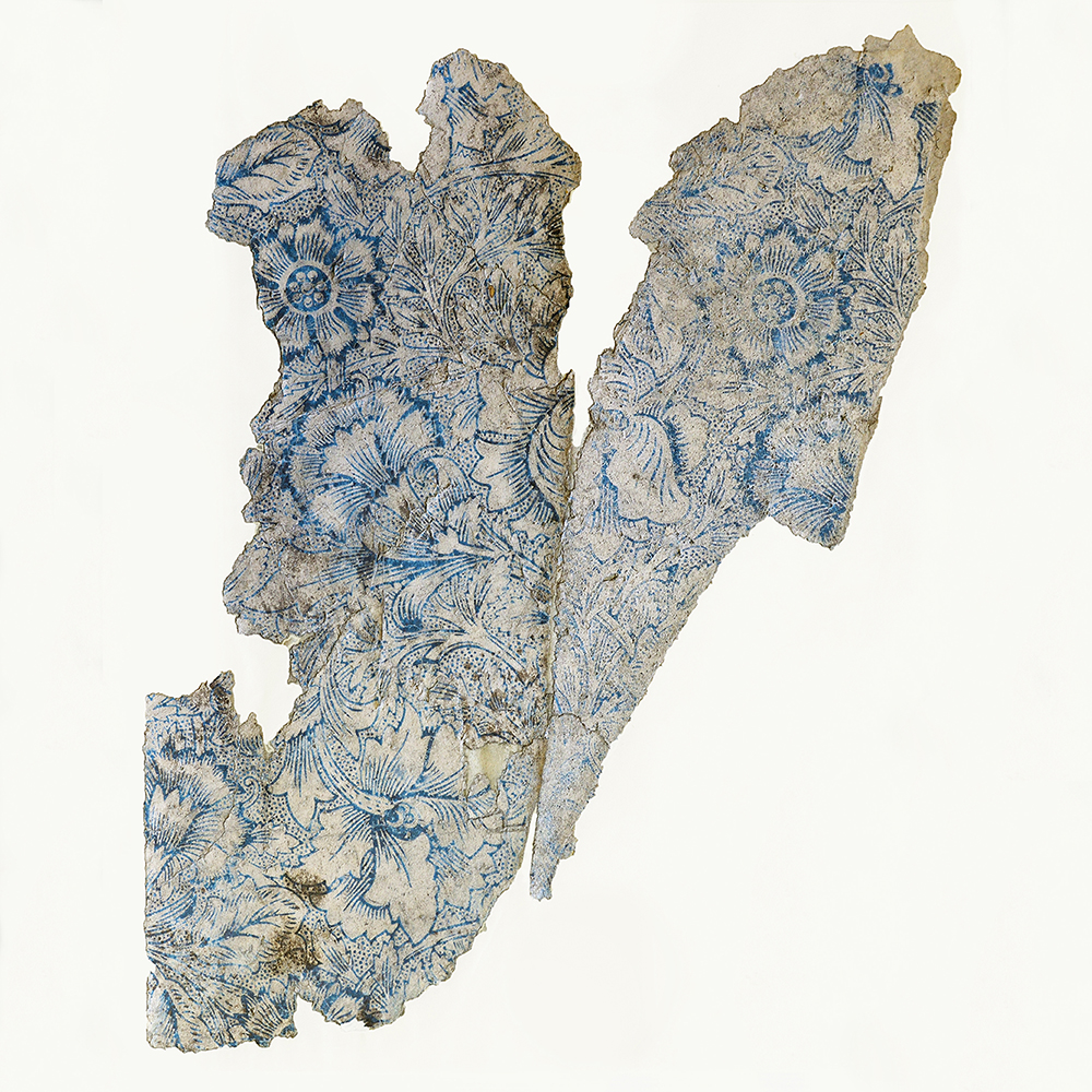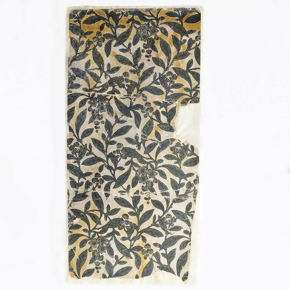 These fragments of wallpaper were originally from the Estate Office at Belsay. They are shown here after conservation and reassembly, when the original pattern of the wallpaper became more visible