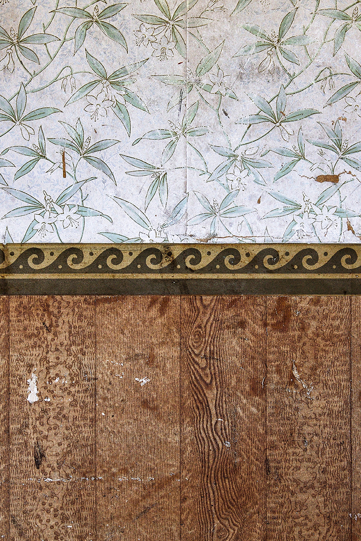 The sanitary wallpaper from the servants’ mezzanine hallway. The varnished early 20th-century paper with flower design is shown on the left and earlier paper from the end of 19th century is on the right