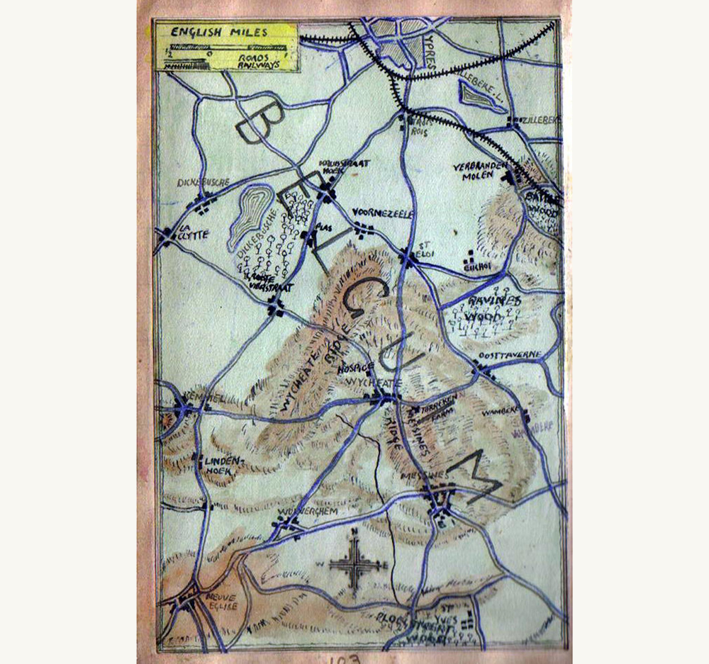 Over the following four months Arthur was at the front line three more times, at Pilckem Ridge, Neuve-Église and finally Kemmel. His diary records the exhausting swings in emotion suffered by men in his situation. On 20 September he reports, ‘Business is slack around this quarter. It suits us fine’. The next day, after a harrowing night as a ration guide to forward positions, Arthur bluntly notes, ‘I nearly won a wooden cross on my back’.