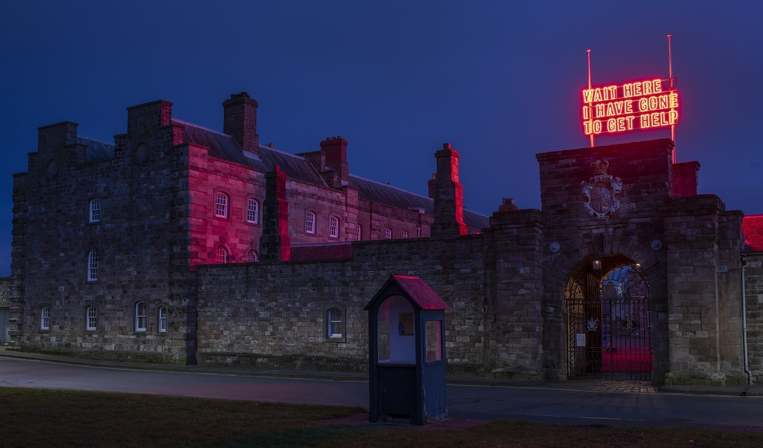 Etchells said about the work “It’s always an interesting to make work specially for a particular site. It’s a process that involves practical and quite pragmatic consideration of the location in terms of possible places to install a work as well as providing the chance to consider the different stories and ideas that are circulating in a place. In the case of the Berwick Barracks I was thinking about its origin as part of a defensive outpost, and the way it resonates with narratives of danger, attack and defence. I wanted something that would resonate strongly with the situation and the phrase used in Wait Here seemed to open lots of possible interpretations, serious and comical at the same time.”