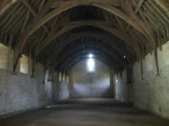 A spectacular 14th century monastic stone barn, 51 metres long, with an amazing timber cruck roof.