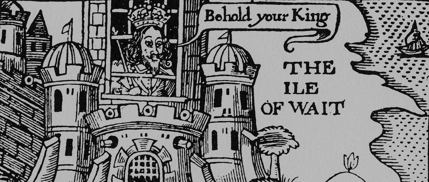 ‘The Isle of Wait’, a contemporary woodcut parody of Charles I’s imprisonment in Carisbrooke Castle, showing him stuck in the bars of a window