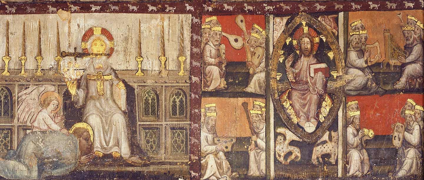 The final departure of the Commons seems to have provided an opportunity for new decoration inside the Chapter House, in the form of some magnificent wall paintings. A fine depiction of the Last Judgement was painted behind the seat from which the abbot administered judgement to his monks, and more naïve scenes from the Book of Revelation were depicted on other walls.