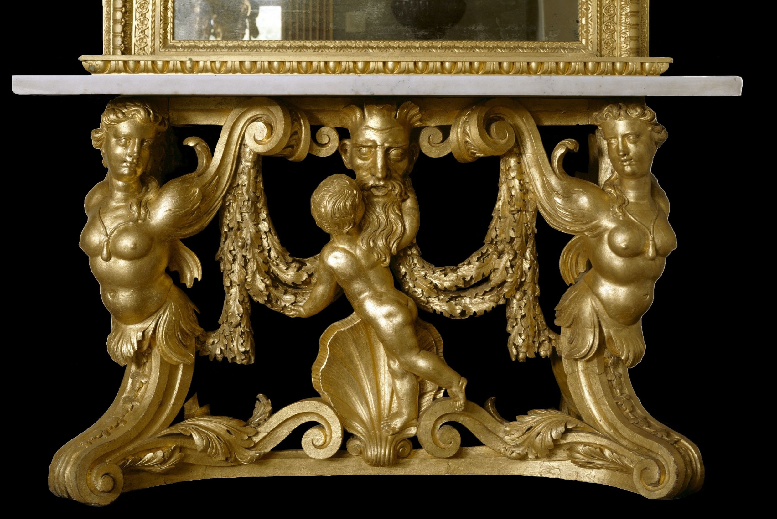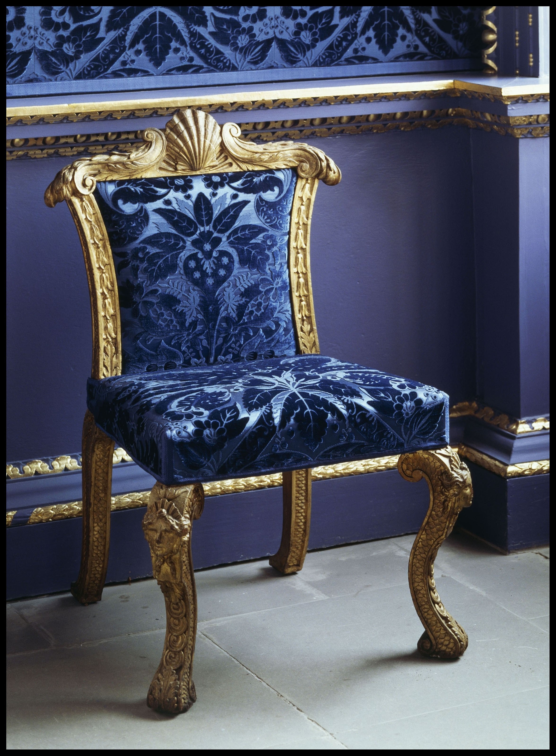 Burlington’s friend and collaborator William Kent designed furniture specifically for the house. The collections include his mahogany and gilt chairs and a spectacular pair of marble-topped tables, which enhance the richly gilded interiors.