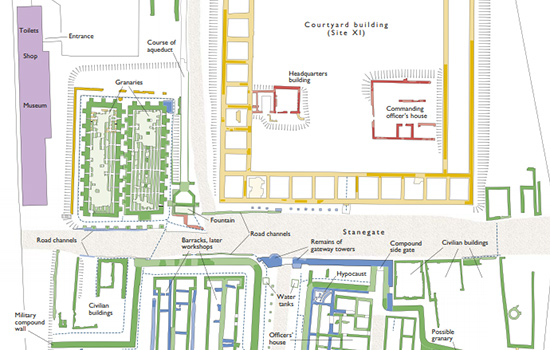 Read about the surviving buildings of Corbridge – including the granaries with their intact ventilation system – and imagine how the town would have looked in its heyday.