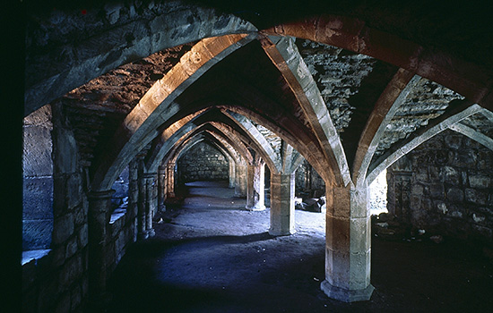This impressive vaulted undercroft or basement lay below the monks’ dining hall or refectory, in the south range of the cloister. It dates from the 14th century