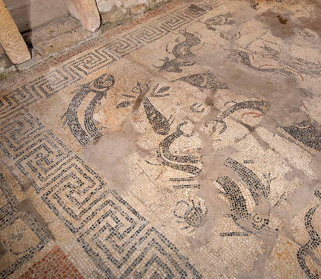 The geometric pattern in this corner of the mosaic from the caldarium (hot room) of the baths features interlace patterns. They have been made with great skill, with the two- and three-strand plaits joining almost seamlessly.