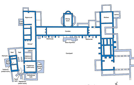 The original plan of the main villa was a symmetrical U-shape, carefully terraced into the hillside.[3] The west wing consisted almost entirely of two bath-houses (suites of baths), which were both in use at the same time. The east wing comprised kitchens and storerooms. A rectangular dining room projected from the north side of the central range, which was probably open on one side to provide a covered walkway with a view down the hillside. Both wings had an upper floor where the family lived, and there was probably an upper level above the walkway too. The villa’s entrance may have been straight onto the upper storey.