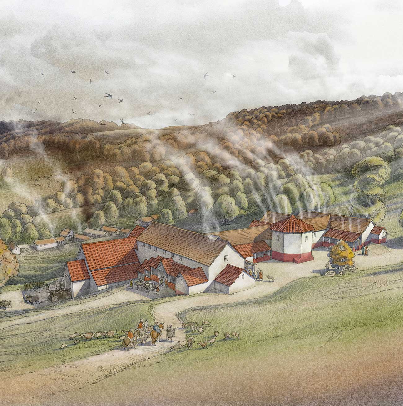 A reconstruction drawing showing how Great Witcombe Roman Villa might have looked in the 4th century AD