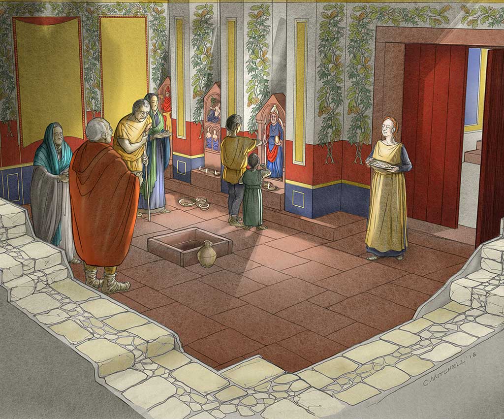 A reconstruction of the underground room at Great Witcombe Roman Villa, which may have been a shrine. Hand-washing and food offerings were important features in many aspects of Roman and British ritual practices, and may well have taken place here