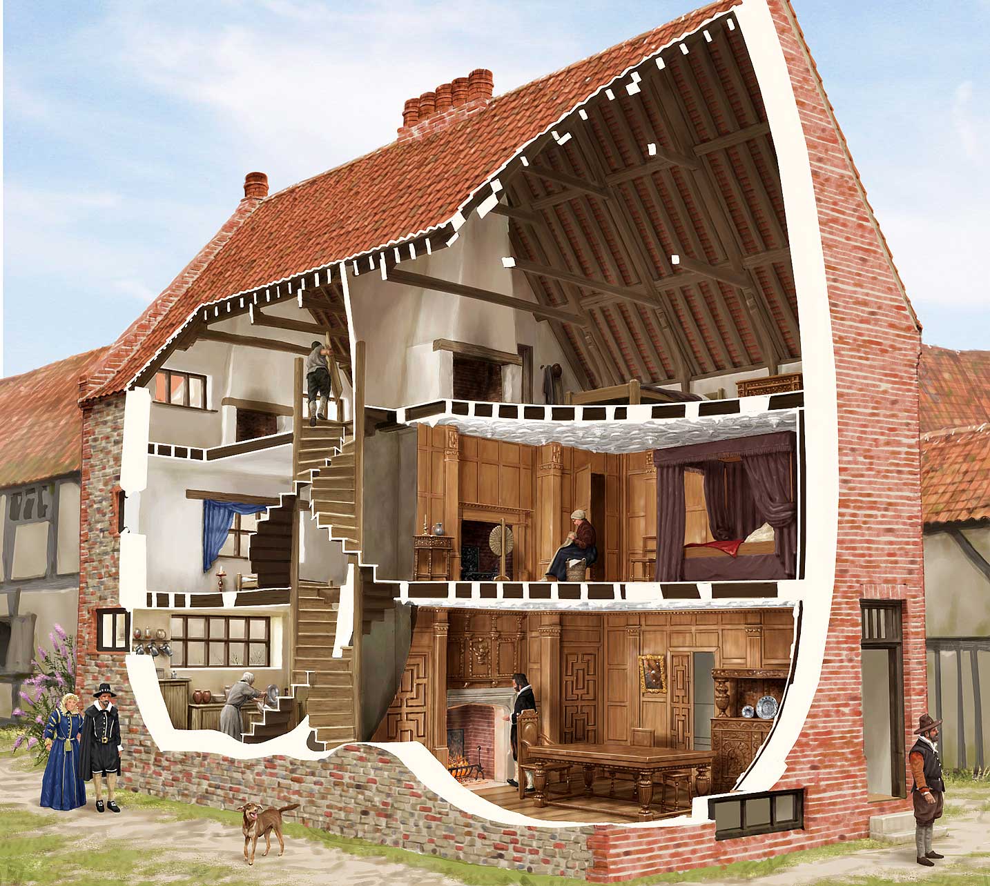 The flamboyant plasterwork ceilings in the Old Merchant’s House – remarkable survivals from the early 17th century – and fine oak panelling indicate that it was home to a prosperous merchant of some standing in the town. Despite many alterations over the centuries and Second World War bomb damage, Row 111 House survives with its 17th-century structure largely intact – the reason it was saved from postwar demolition.