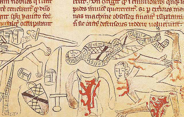 Top image: The Battle of Evesham and the death of Simon de Montfort, depicted in an early 14th-century manuscript. Courtesy British Library (Cotton Nero D.II fol 177)
