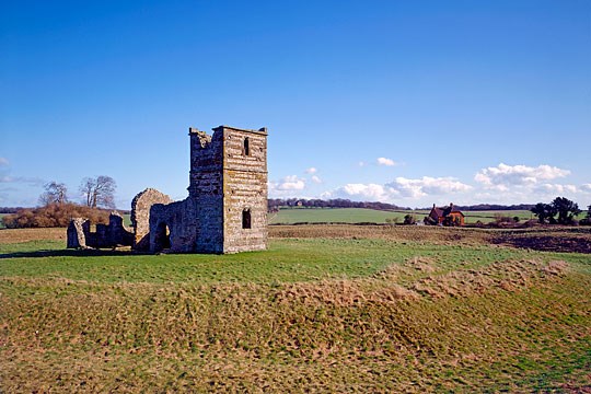 The 12th century church is built of stone and flint, and the line of the roof remains clearly visible on its eastern face.