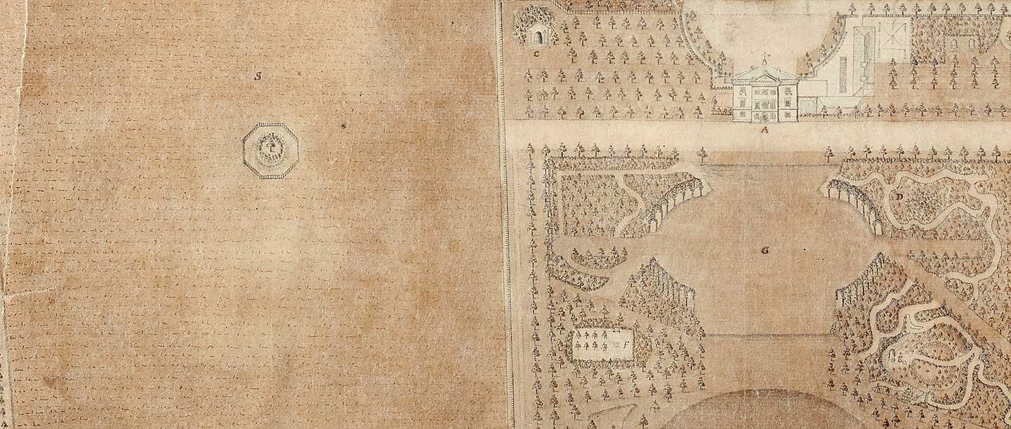 The plan includes a key, which labels many of the garden features including a Green House, Ice House and Ice House Seat, Flower Garden, Ninepin Alley and Grotto. It also shows the layout of the garden, allowing us to recognise – for the first time – that it was based on ideas from classical literature and the gardens of ancient Rome. And it shows us lots of detail of planting – where hedges were located, as well as distinguishing between groves (trees laid out in a regular formation), orchard, wilderness areas and densely planted areas or thickets.