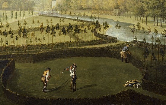 An early 18th-century engraving of a ninepin alley. Ninepin alleys were very briefly fashionable in gardens at this time – the game was played using small, solid balls, and was much more like skittles than modern ten-pin bowling