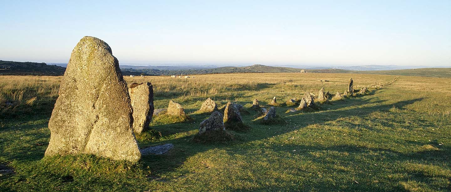 The group of monuments at Merrivale is one of the finest on Dartmoor: side by side here are the remains of a Bronze Age settlement and a complex of ritual sites.