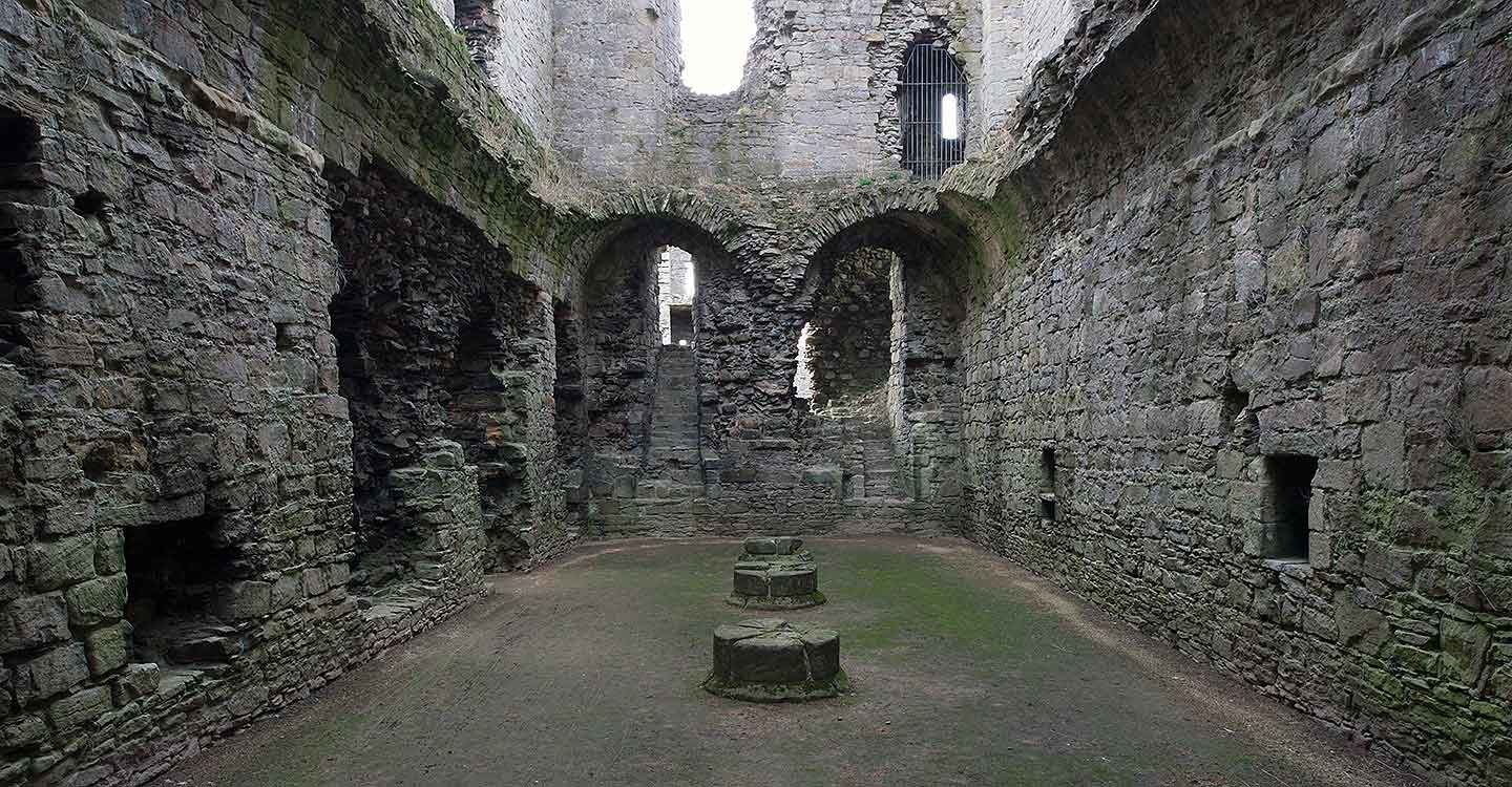 The keep is divided down the middle by a spine wall. Immediately beyond the first-floor entrance was a vaulted ante-chamber, where visitors waited before being admitted to the great hall.