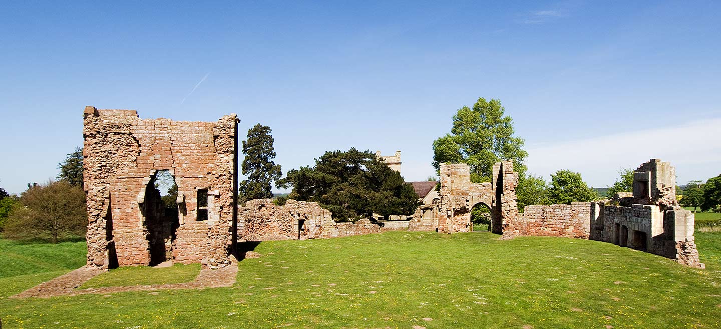 The courtyard at Moreton Corbet, looking west. The earliest buildings are the great tower (left) and gatehouse (centre), built around 1200. The great tower was a strong place of refuge and defence, but the remains of a fine, large 13th-century fireplace on the first floor indicate that it also contained a comfortable private chamber for the lord of the castle. Elsewhere in the courtyard of the castle there would have been a hall and other domestic buildings, but no traces survive.