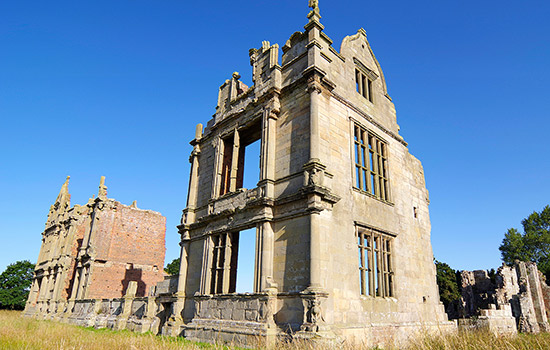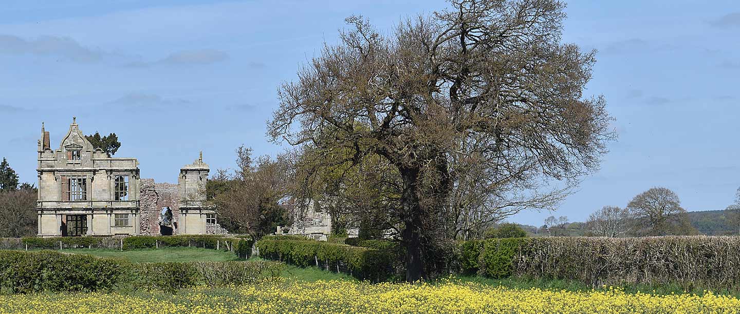 The ruins of the medieval castle and Tudor manor house of the Corbets are dominated by the theatrical shell of an ambitious Elizabethan mansion wing in Italianate style.