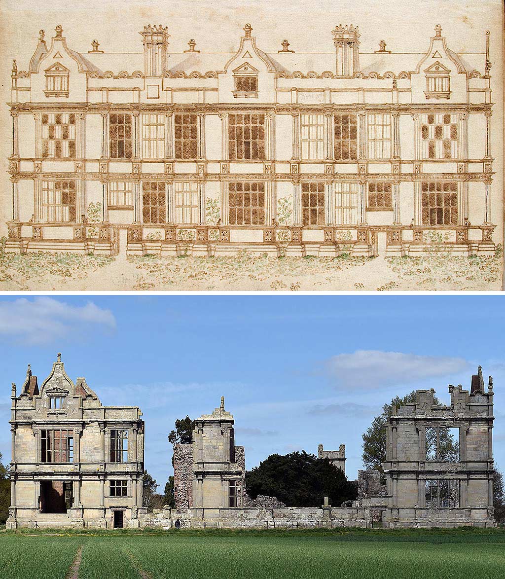 Sir Robert’s symmetrical south range had huge grid windows, a pitched slate roof partially concealed by tall gables, and rich, classical detailing. It was probably inspired by Renaissance architecture in contemporary great houses in England, with some French and Flemish influences.