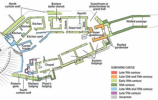 In 1178 Reginald paid for a papal licence to have a private chapel here, and it may have been soon after this that he started to build at his new castle. Archaeological evidence shows that he and his son Robert (d.1242) rebuilt the east bailey in stone, adding a new gatehouse and a range of buildings along the north side.