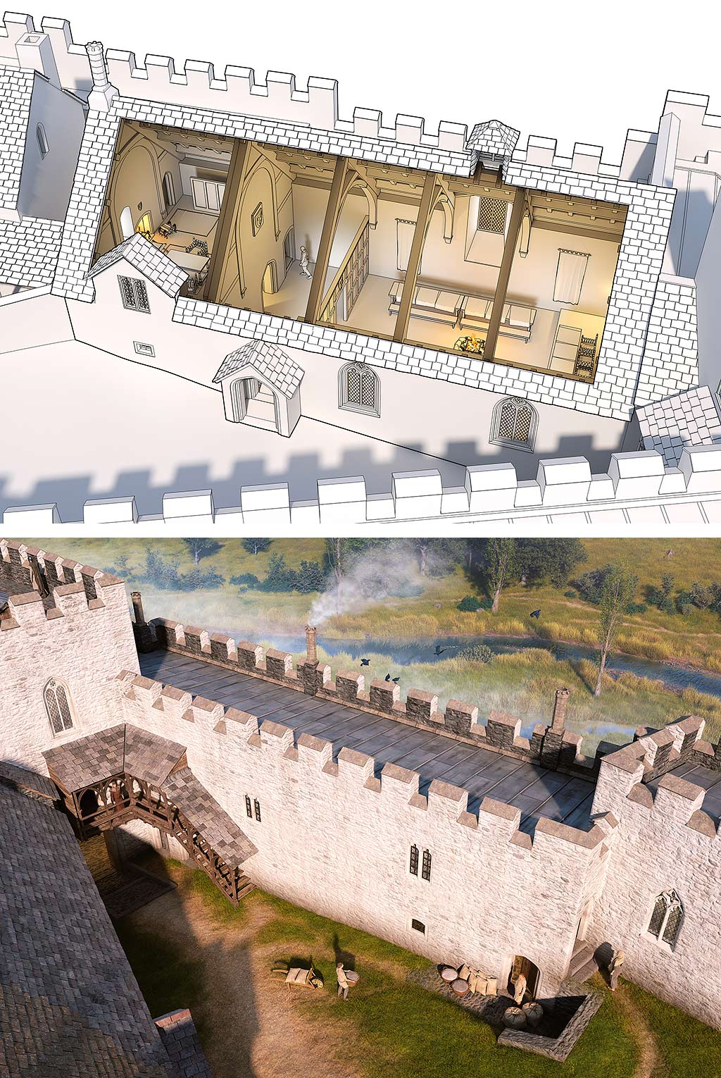 Move the sliding bar to compare two reconstruction views showing how the castle may have looked in about 1100 (left) and about 1400 (right), following rebuilding works in the 14th century. © Historic England (illustrations by Josep R Casals)