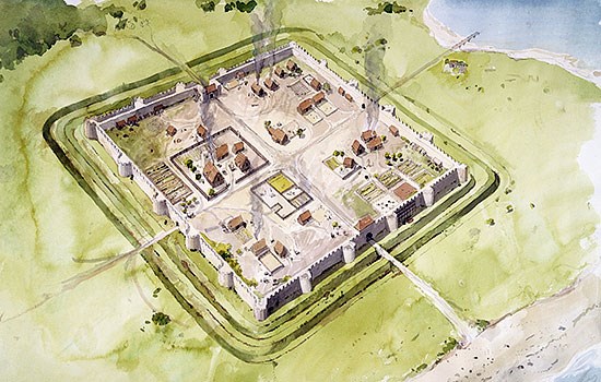 The Roman fort here seems to have been fairly constantly occupied up to the end of Roman Britain in the early 5th century. The burial of 27 infants inside the fort suggests that there were substantial numbers of civilians here as well as a military presence. There were timber houses and workshops surrounded by animal pens, cesspits and rubbish heaps within the fort’s walls.[3]