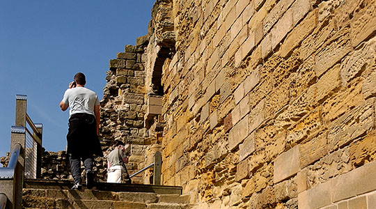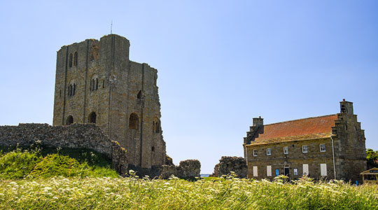 The view out to sea from Scarborough Castle, with the keep in the foreground