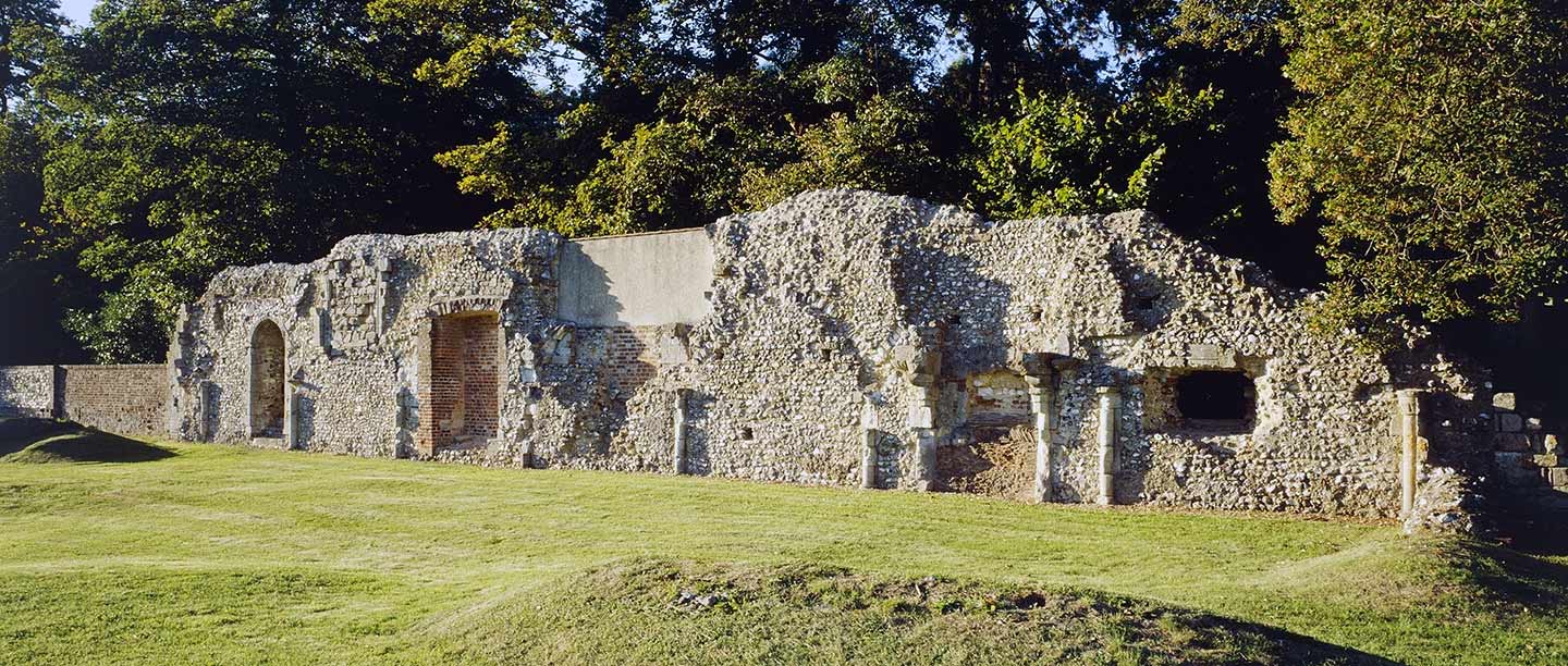 Henry VIII closed the priory in 1538 and its buildings were converted soon afterwards into a mansion. The surviving wall – from what was once a large complex of buildings – is the north side of the canons’ refectory, or dining hall. It formed one range of the four-sided monastic cloister, with the church on the opposite side.