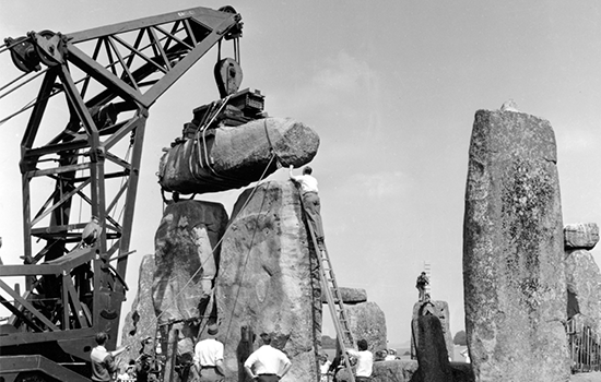 Restoration work on the Stonehenge sarsen circle in 1919. A lintel is in the process of being replaced