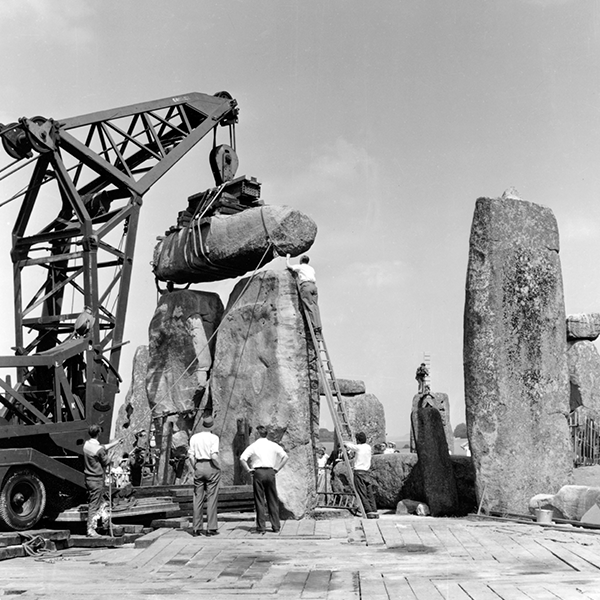 This major engineering project and associated excavations began in 1958 and continued into 1959. Atkinson, Piggott and Stone together oversaw the archaeological work. The trilithon was re-erected from the position where it had lain for 161 years. An upright and a lintel forming part of the outer circle were also put back into position. One of the large sarsens of the inner horseshoe was set in concrete and a large hollow at its base infilled. Further sarsen stones were set in concrete to prevent future movement. Finally, six fallen bluestones were lifted and straightened.