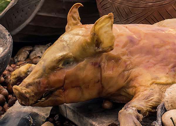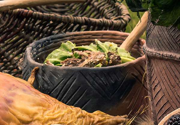 Of the bones and teeth excavated at the site, 90% were from pigs, and the rest mostly from cattle. Many still had meat attached to them when they were discarded, suggesting that there was more than enough food to go round. Some of the bones have cut-marks made by flint tools, showing that beef was cut up into pieces. Burnt foot bones suggest that pigs were often roasted over open fires.