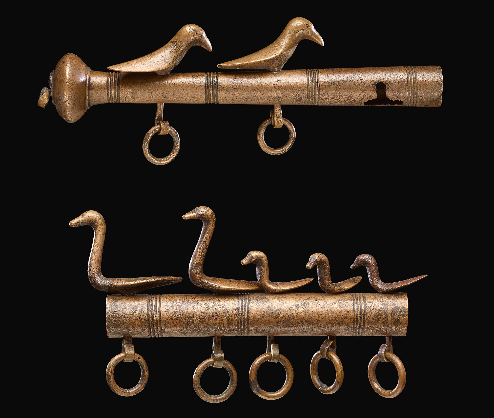 Flesh-hooks, which were used to lift meat from large cooking cauldrons, also became purely ceremonial objects. This flesh-hook, found in Dunaverney, County Antrim, Northern Ireland, has a family of swans and two ravens on the shaft.