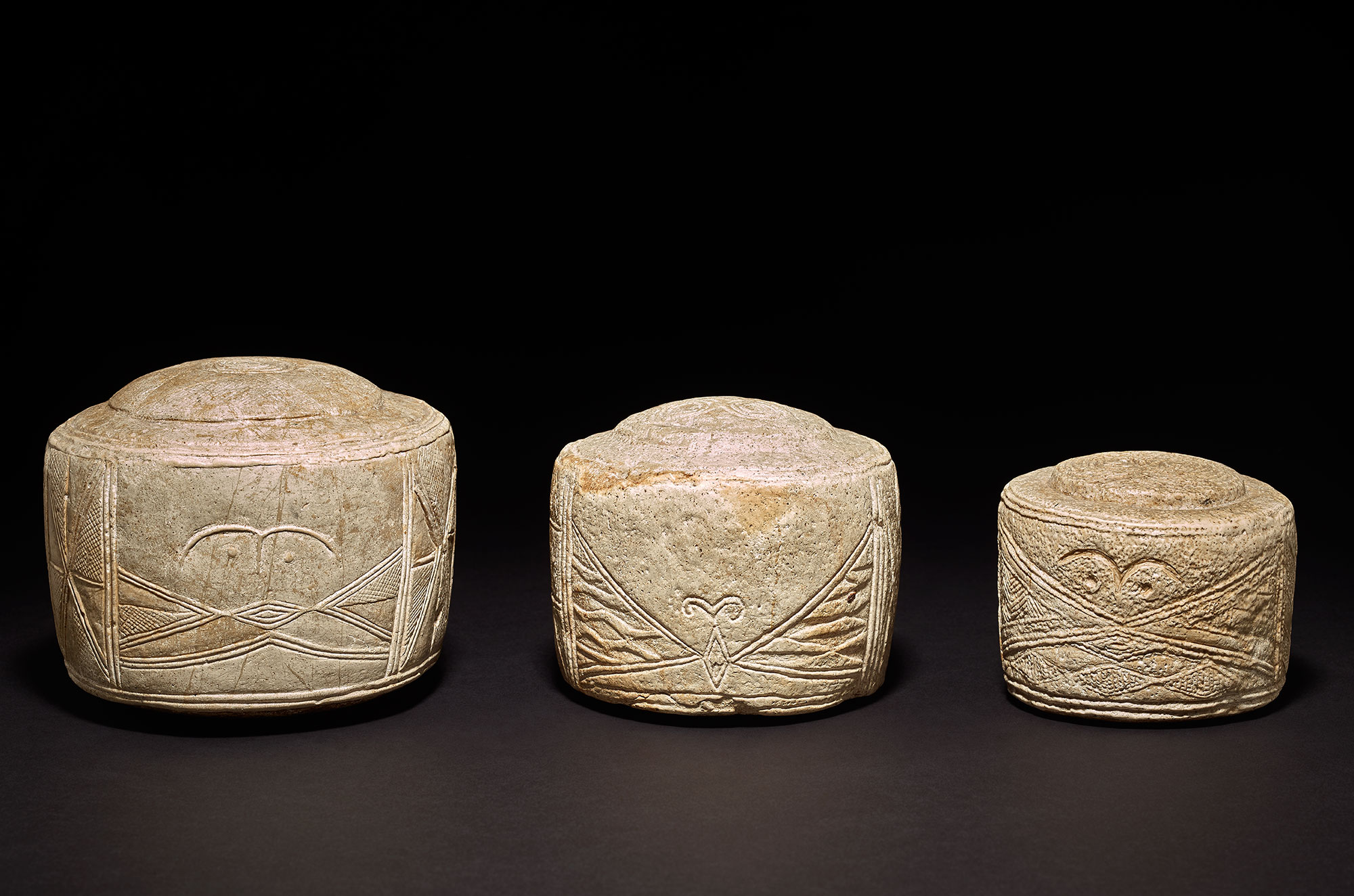 These three carved chalk cylinders, known as the Folkton Drums, date from this time. The distinctive patterns of spirals and lozenges seen on the drums also appear on megalithic monuments, Grooved Ware pottery and other portable objects, showing that people from across the British Isles were sharing ideas, styles and ritual practices.