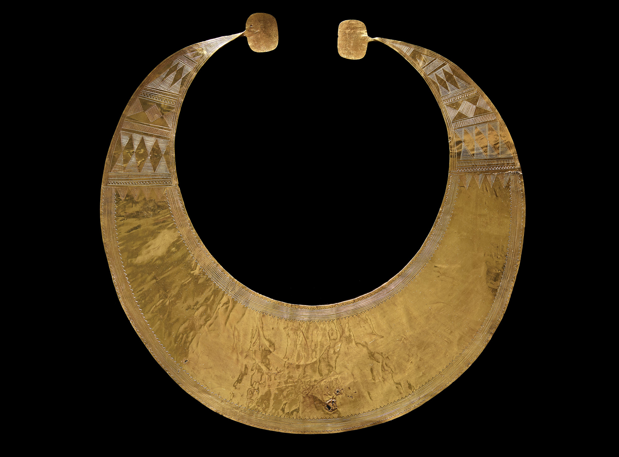 This collar, known as a lunula, is made from a thin sheet of beaten gold. It was found in Blessington in Ireland and dates from between 2200 and 1800 BC. The incised geometric decoration links it to pottery and textiles which were made and used across a large part of Europe at this time, the early Bronze Age.