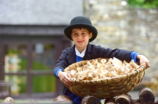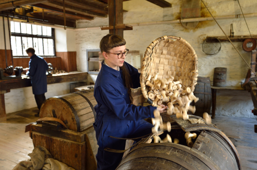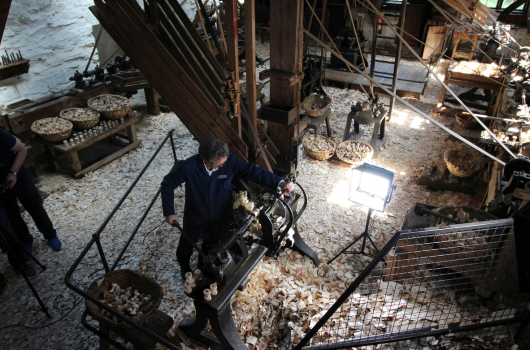 A volunteer demonstrating turning a bobbin at Stott Park Bobbin Mill