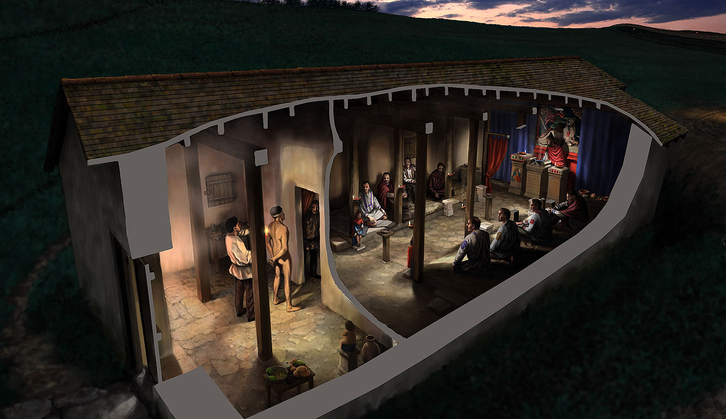 A cutaway reconstruction drawing of the temple of Mithras at Carrawburgh, imagining its appearance during a ceremony in the 3rd century AD. A novice has undergone an ordeal in the outer room (left) and is about to be revealed to the worshippers in the main area