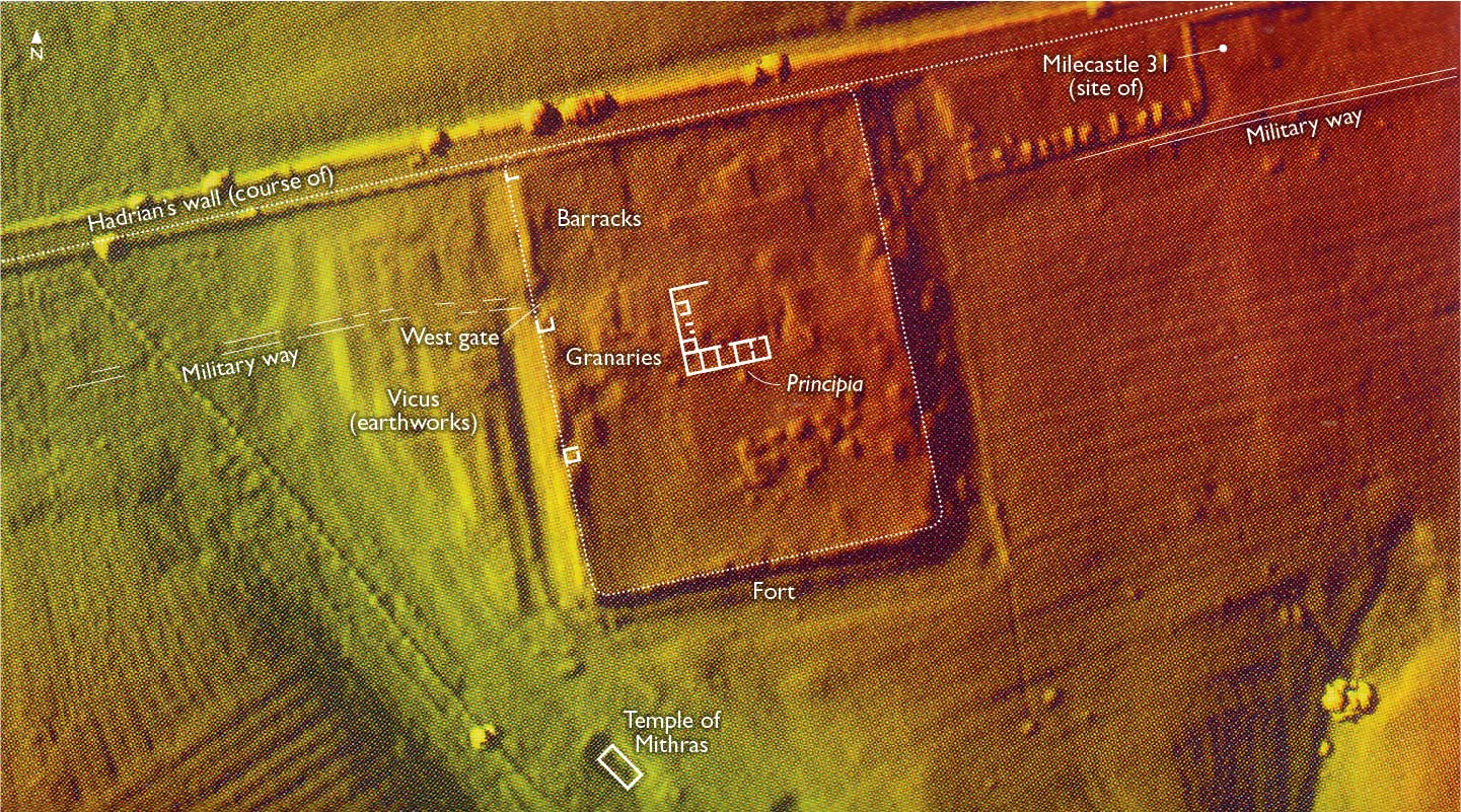 Earthwork remains of the civilian settlement or vicus are visible west and south-west of the fort, on a series of artificial terraces on the slope down to Meggie’s Dene Burn, with the stone-built temple of Mithras lying in the valley bottom. Sub-surface surveys have shown that the remains of streets and buildings of the vicus also survive around the south and east sides of the fort.