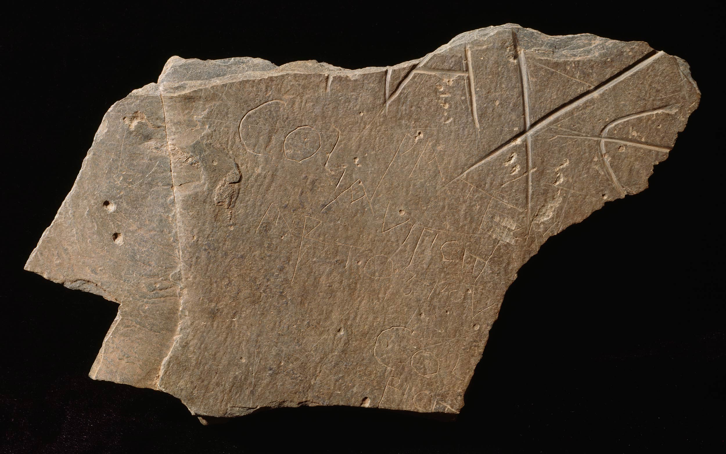This inscribed slate was found during excavations in 1998. It has names written in 6th-century letters, including ‘Artognou’ and ‘Colianuus’, literate people who perhaps lived in the settlement at Tintagel.
