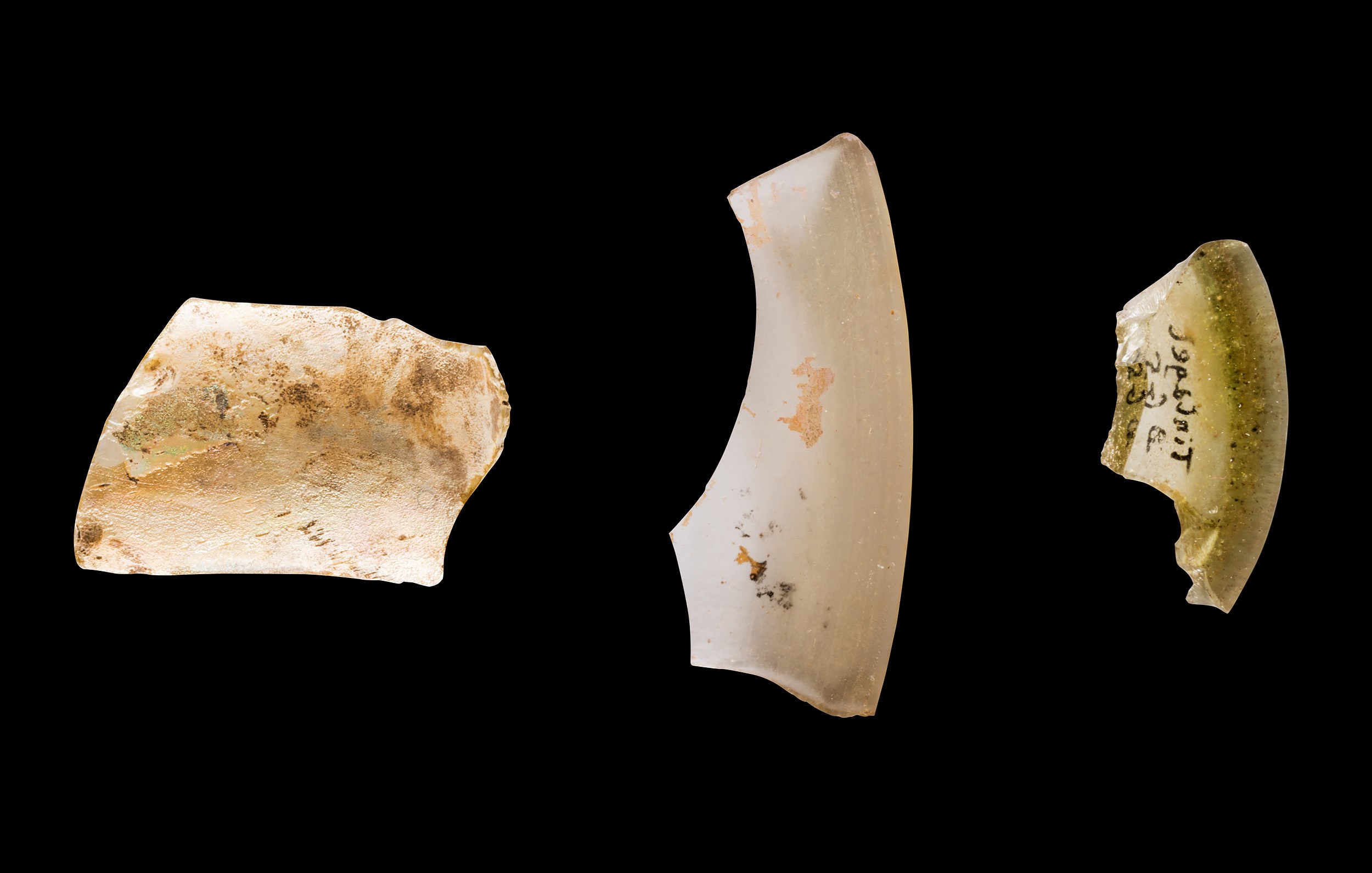 These glass fragments from a bowl, a stemmed glass and a flask were probably made in southern France. At this time glass vessels were rare, and their presence shows the high status of the occupants of Tintagel.