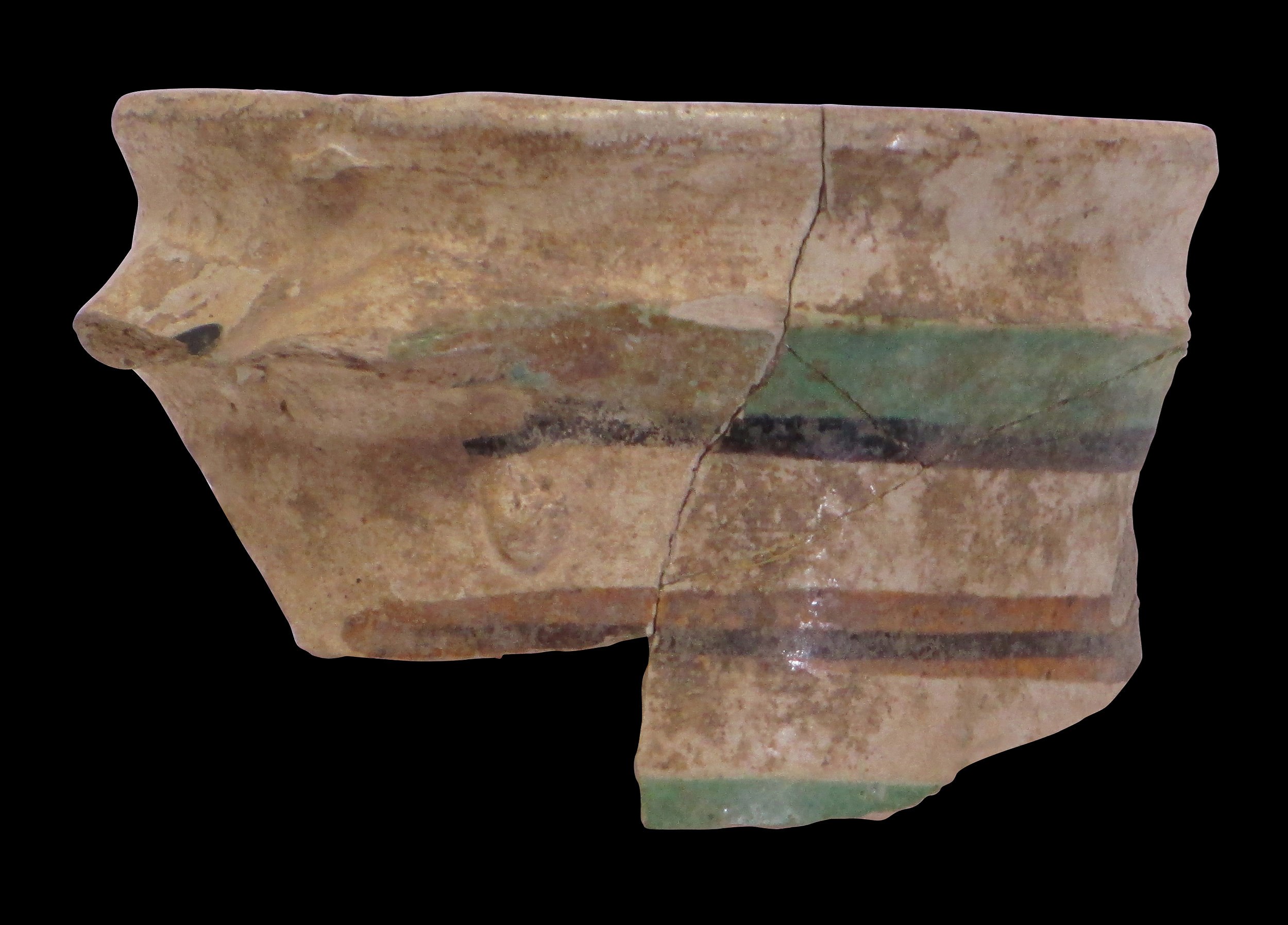 This piece of 13th-century multi-coloured jug, made in Saintonge, France, was probably used to serve in the Great Hall. Such high status pottery suggests that important visitors were received here.