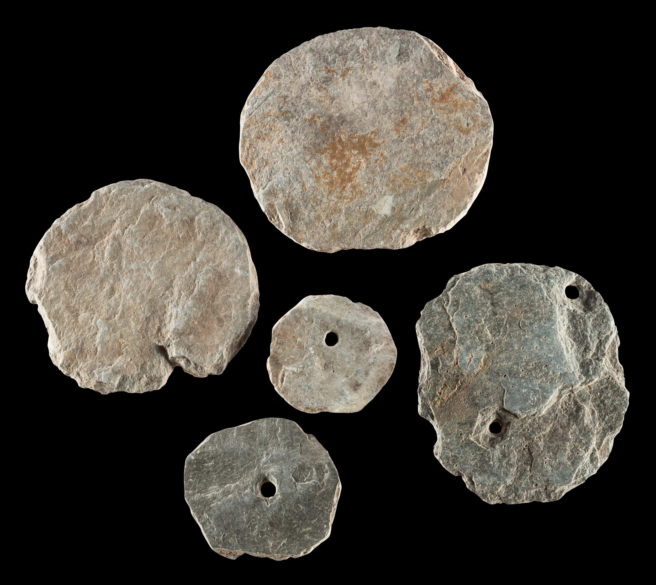 These discs were probably all stoppers, used to seal amphorae in conjunction with beeswax. Made of local slate, they show that the pottery vessels were being reused for some purpose at Tintagel.