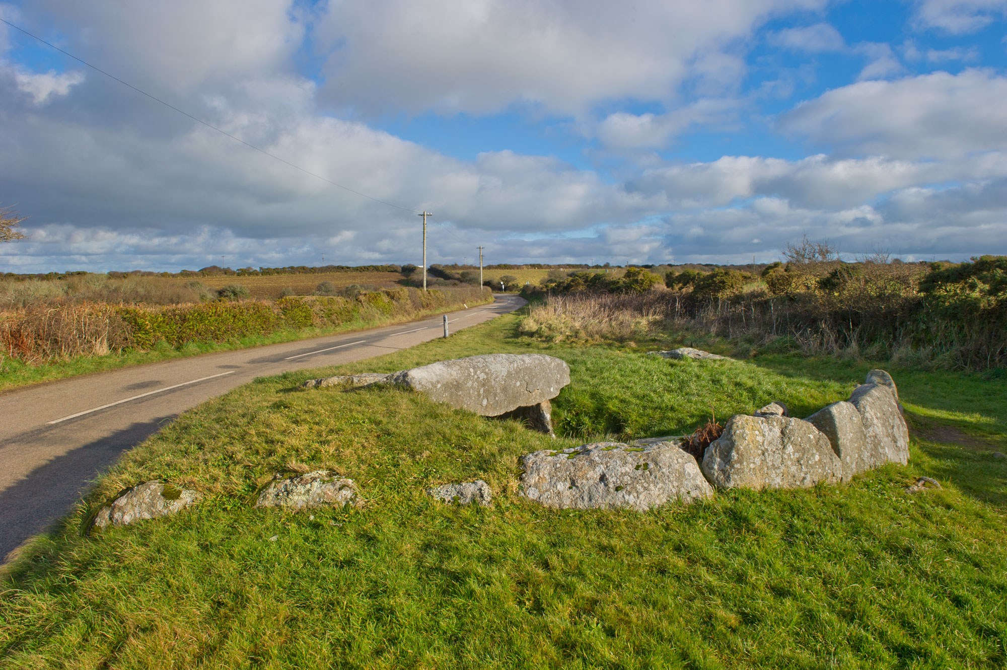Parking: There is a small parking area for the Merry Maidens Stone Circle, a short distance away from the chamber. The chamber can be found by following the road to the south-west. Please take care walking along the grass verge.