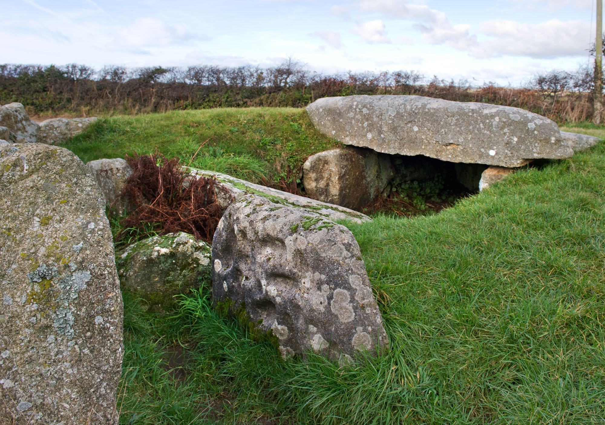 Tregiffian is a Neolithic or early Bronze Age chambered tomb with a walled and roofed entrance passage which leads into a central chamber.