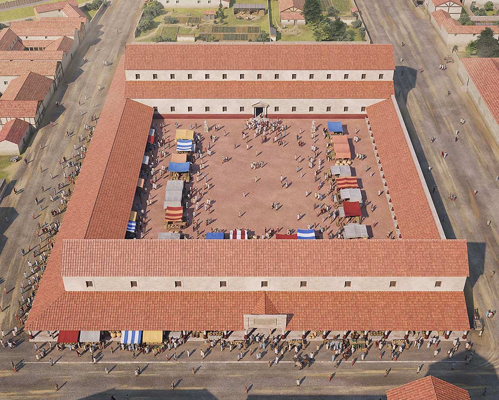 The creation of the bustling fortress attracted people from the local area and further afield to settle outside in a settlement called the canabae (booths). These people were under the formal control of the army and many who lived there were the families of the soldiers, as well as traders and merchants.[6]