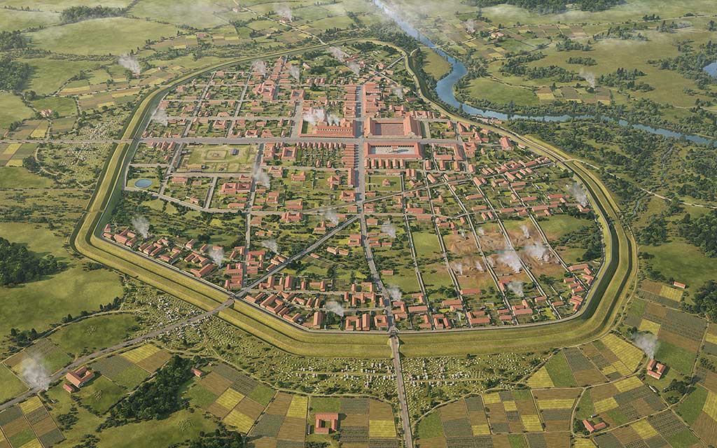 While the buildings of the fortress contributed to the early city’s townscape, the city founded by the new civic authority – probably a mixture of local elite families and veteran soldiers – was four times larger than the 16-hectare fortress. The 78-hectare city was laid out by using the existing street plan of the fortress, the grid-iron pattern indicating that it was laid out by trained surveyors who must have been veteran soldiers.