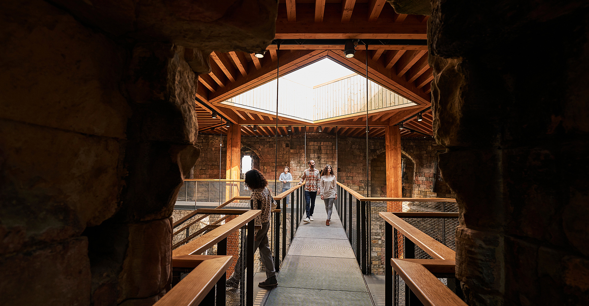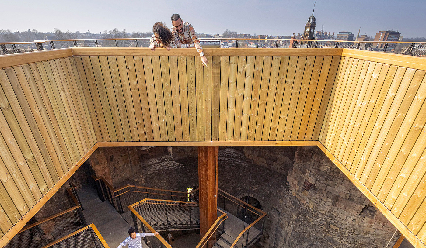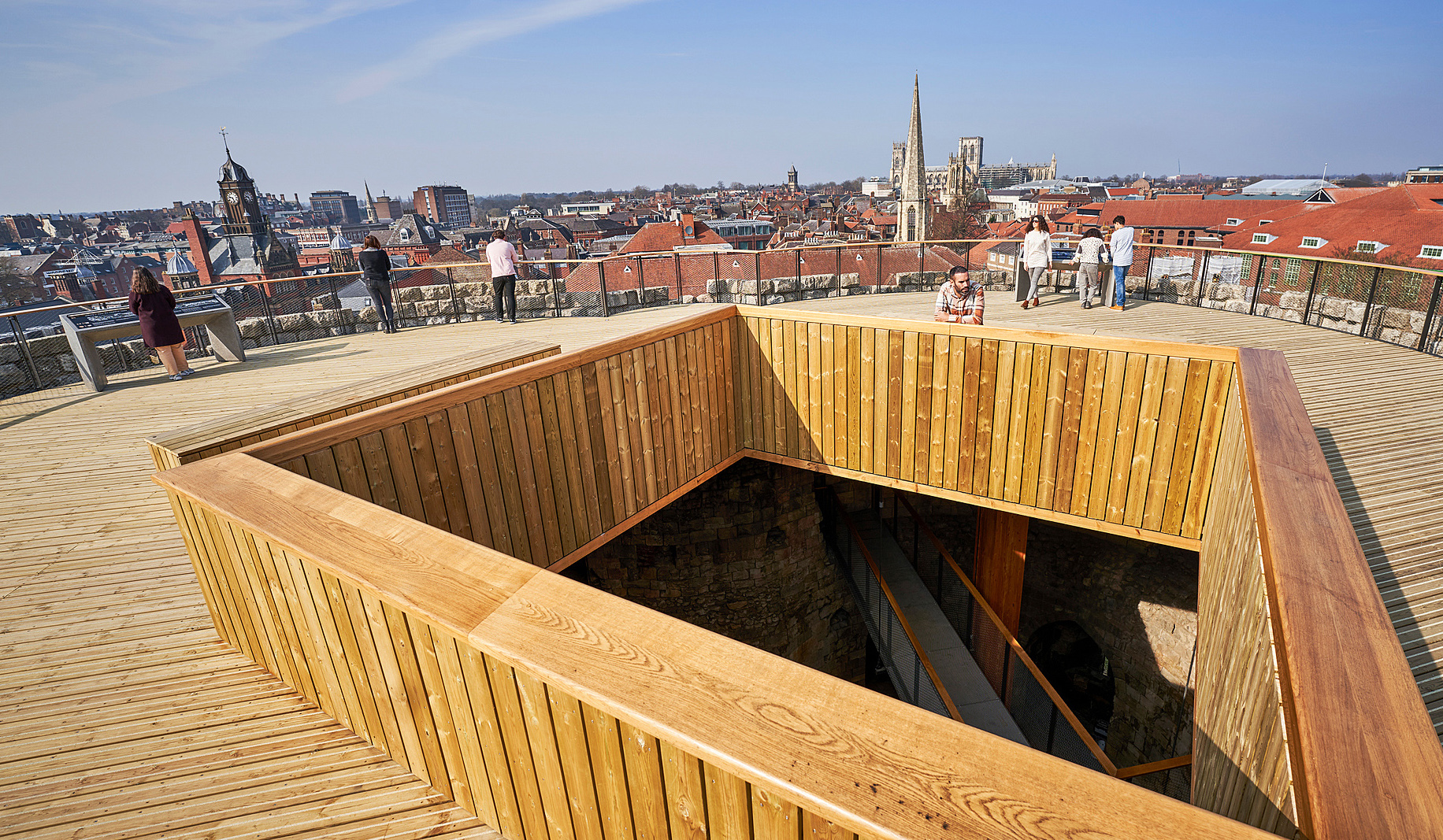 As part of the recent major conservation project at Clifford's Tower, an enormous structural timber frame has created the tower’s new roof deck. Fitted with timber benches, floor lights and a surrounding safety rail, you can enjoy the space as a magnificent viewing platform.